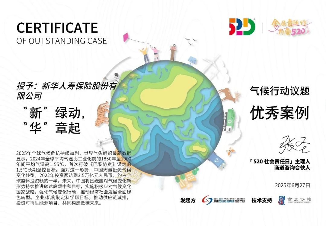 新华保险高度重视气候变化带来的系统性挑战,通过加强顶层设计与实践落地的双轮驱动,持续推动气候风险管理与绿色金融协同发展。“新绿动,华章起”入选“520社会责任日”“气候行动”议题优秀案例,彰显在助力“双碳”目标、引领行业绿色转型中的专业实力。